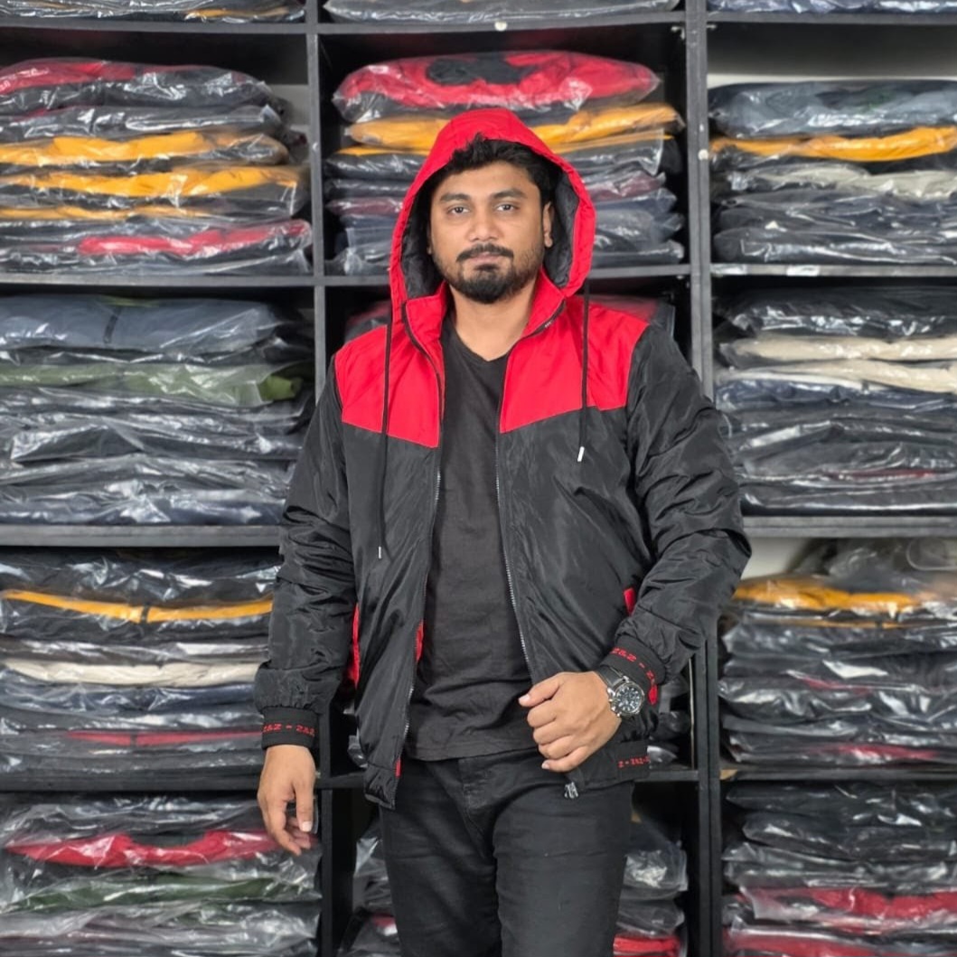 কনট্রাস্ট কালার সাসকিন ফেব্রিক্সের হুডি জ্যাকেট, এয়ার এ্যান্ড ডাস্ট প্রুফ।